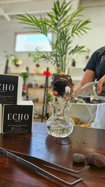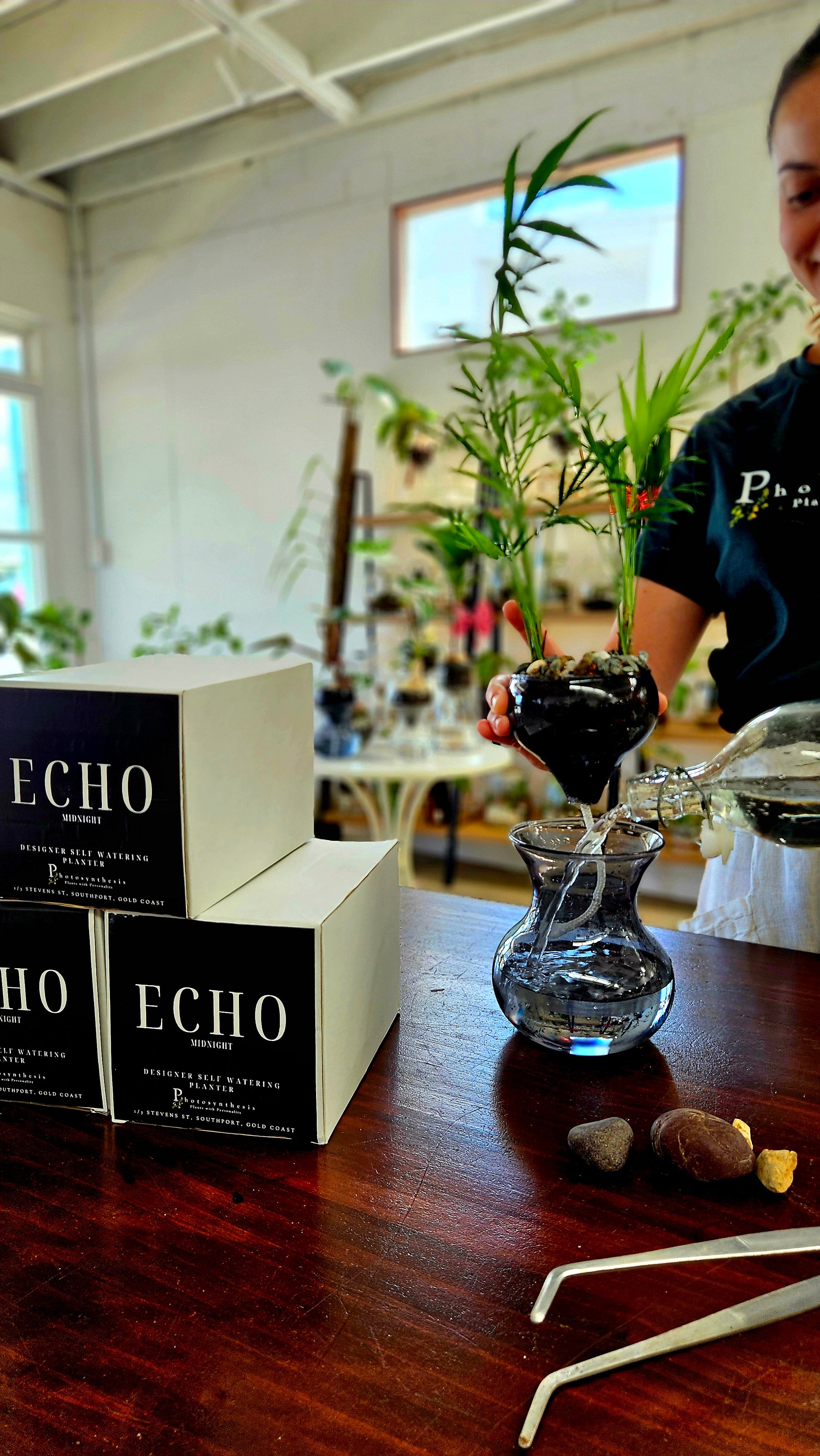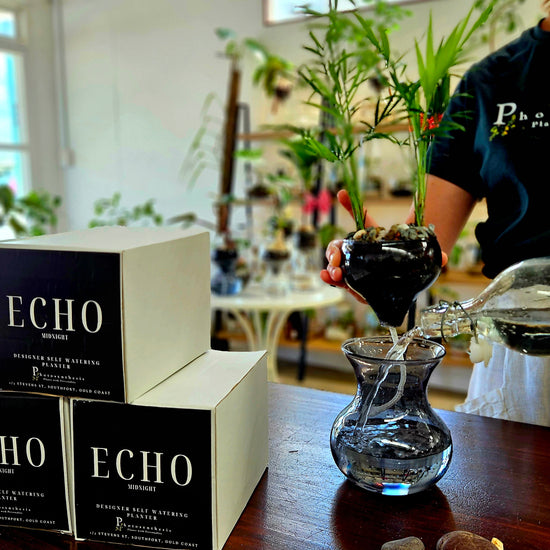 The Echo system features a transparent water reservoir that allows you to see the water level and the water is drawn up to the plant through our signature wick. This innovative design ensures you can easily monitor hydration without guesswork. Simply fill it up, and your plant will take what it needs.